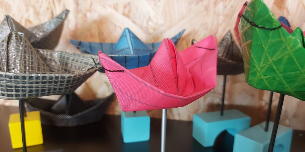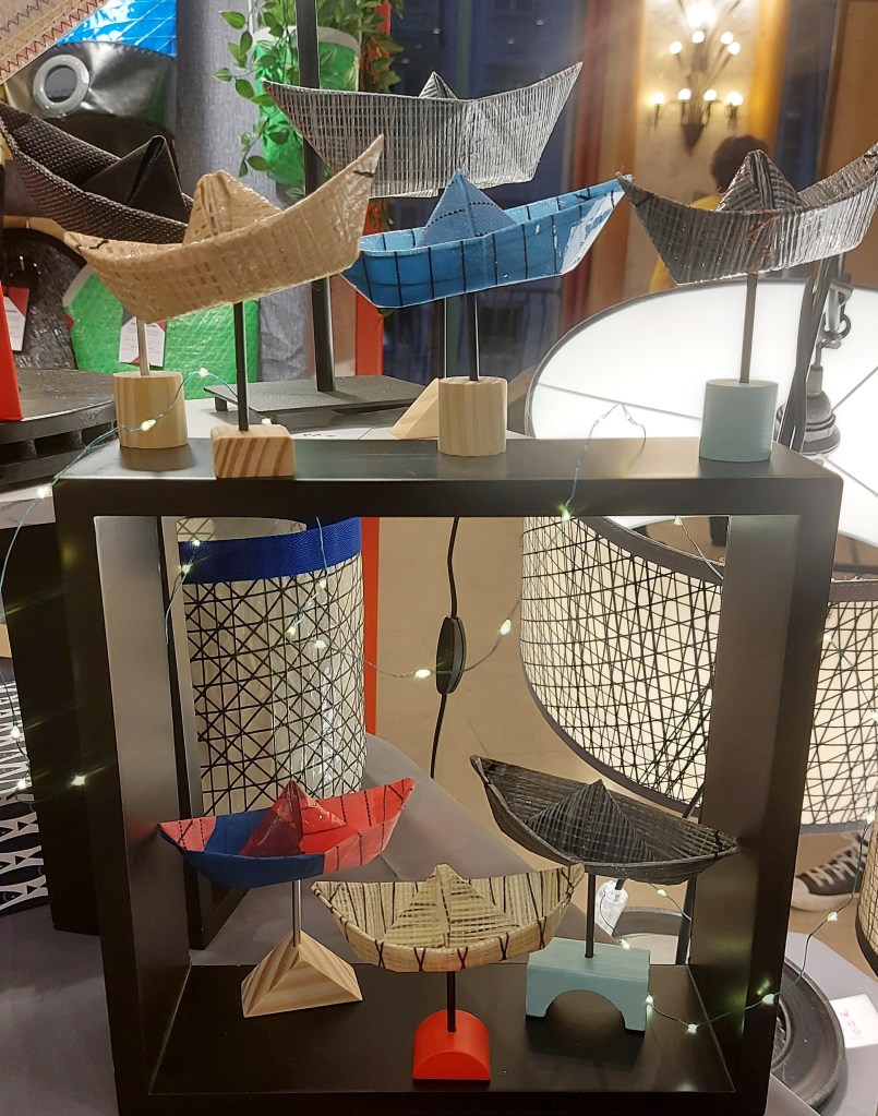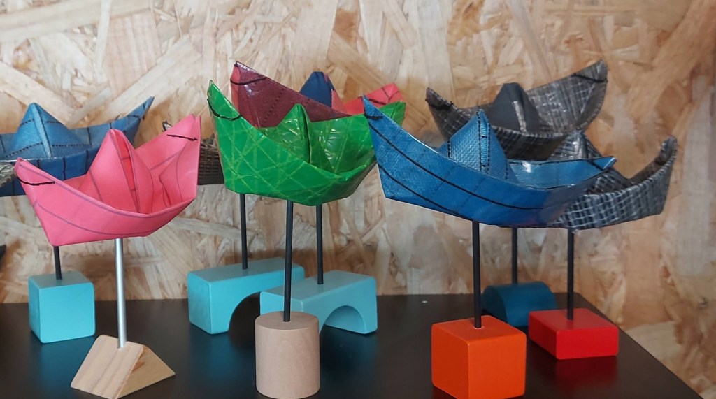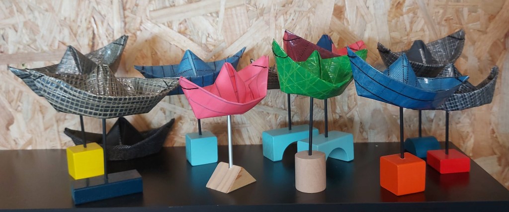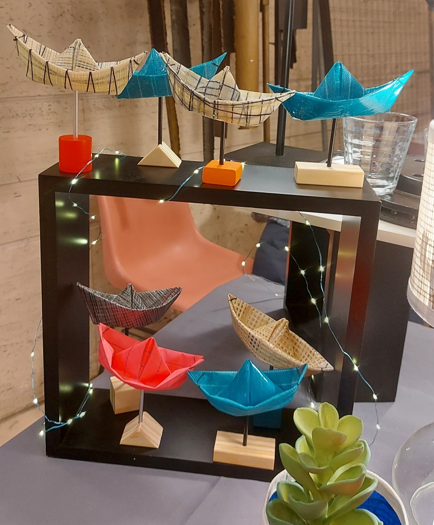 Chaque bateau est soigneusement conçu à partir de voile de bateaux recyclées et monté sur un socle élégant, ce qui en fait une pièce unique et attrayante pour n’importe quel espace.